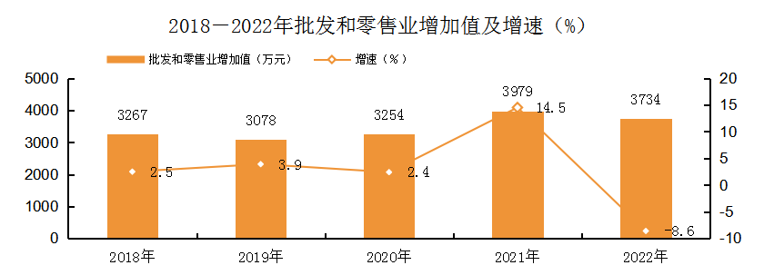 全年實現(xiàn)批發(fā)和零售業(yè)增加值3734萬元,同比下降8.6%。其中,批發(fā)業(yè)增加值1976萬元,同比下降1.3%;零售業(yè)增加值1757萬元,同比下降15.0%。實現(xiàn)住宿和餐飲業(yè)增加值1340萬元,同比下降29.7%。其中,住宿業(yè)增加值207萬元,同比下降45.1%;餐飲業(yè)增加值1133萬元,同比下降26.1%。