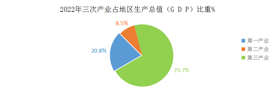 初步核算,全年實現(xiàn)地區(qū)生產(chǎn)總值(GDP)179103萬元,與上年同期相比增長3.9%(按可比價格計算,下同)。其中,第一產(chǎn)業(yè)實現(xiàn)增加值37289萬元,增長5.0%,對經(jīng)濟(jì)增長的貢獻(xiàn)率為23.76%,拉動GDP增長0.9個百分點;第二產(chǎn)業(yè)實現(xiàn)增加值15104萬元,下降9.9%,對經(jīng)濟(jì)增長的貢獻(xiàn)率為-24.97%,拉動GDP下降-1.0個百分點;第三產(chǎn)業(yè)實現(xiàn)增加值126710萬元,增長5.4%,對經(jīng)濟(jì)增長的貢獻(xiàn)率為101.21%,拉動GDP增長4.0個百分點。第一產(chǎn)業(yè)增加值占地區(qū)生產(chǎn)總值比重20.8%,第二產(chǎn)業(yè)增加值占地區(qū)生產(chǎn)總值比重8.5%,第三產(chǎn)業(yè)增加值占地區(qū)生產(chǎn)總值比重70.7%。人均地區(qū)生產(chǎn)總值(GDP)41953元,增長3.2%。