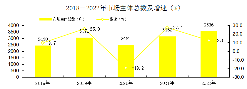 年末全縣市場主體總數(shù)3556戶,同比增長12.5%。其中,內(nèi)資企業(yè)70戶,同比增長25.0%;私營企業(yè)531戶,同比增長12.0%;個體工商戶2821戶,同比增長13.5%;農(nóng)民專業(yè)合作社134戶,同比下降8.2%。