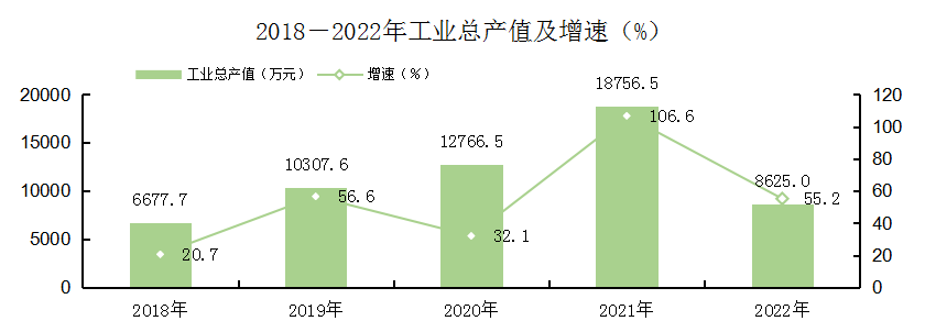 全年工業(yè)企業(yè)實現(xiàn)總產(chǎn)值8625.0萬元,同比增長55.2%。其中,輕工業(yè)產(chǎn)值526.5萬元,同比增長87.1%;重工業(yè)產(chǎn)值8098.5萬元,同比增長53.5%。工業(yè)銷售產(chǎn)值9030.4萬元,同比增長52.0%。其中,輕工業(yè)銷售產(chǎn)值516.5萬元,同比增長90.8%;重工業(yè)銷售產(chǎn)值8513.9萬元,同比增長50.1%。