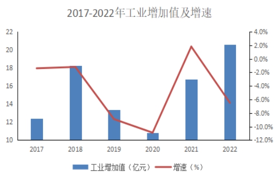 2022年,全區(qū)規(guī)模以上工業(yè)實(shí)現(xiàn)增加值20.58億元,按可比價(jià)計(jì)算,比上年下降6.5%。規(guī)模以上工業(yè)企業(yè)累計(jì)實(shí)現(xiàn)總產(chǎn)值50.09億元,下降10%。按輕重工業(yè)劃分,輕工業(yè)實(shí)現(xiàn)產(chǎn)值0.5億元,下降23.9%,重工業(yè)實(shí)現(xiàn)產(chǎn)值49.58億元,下降9.8%。