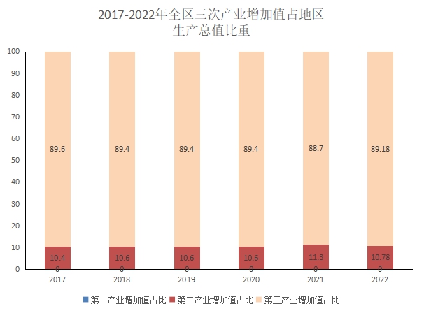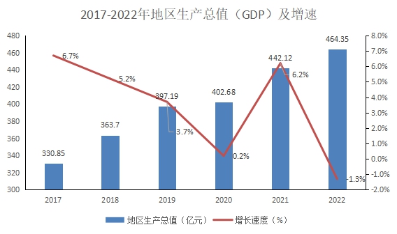 根據(jù)地區(qū)生產(chǎn)總值統(tǒng)一核算結(jié)果,2022年實(shí)現(xiàn)地區(qū)生產(chǎn)總值(GDP)464.35億元,按可比價(jià)計(jì)算,比上年下降1.3%。其中:第一產(chǎn)業(yè)增加值0.22億元;第二產(chǎn)業(yè)增加值51.10億元,下降6.1%;第三產(chǎn)業(yè)增加值413.03億元,下降0.8%。三次產(chǎn)業(yè)結(jié)構(gòu)為0.04:10.78:89.18。