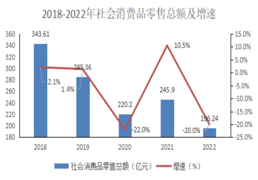 全年實(shí)現(xiàn)社會(huì)消費(fèi)品零售總額196.64億元,下降20%。實(shí)現(xiàn)限額以上社會(huì)消費(fèi)品零售額78.01億元,下降32.3%,其中,商品零售74.29億元,下降32.5%;餐費(fèi)收入3.72億元,下降34.1%。