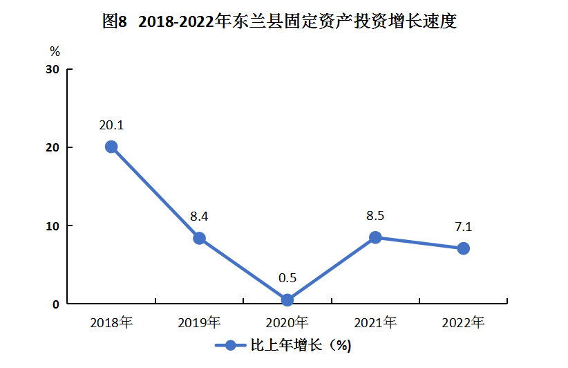 全年全縣固定資產(chǎn)投資比上年增長(zhǎng)7.1%。其中,第一產(chǎn)業(yè)投資增長(zhǎng)46.0%;第二產(chǎn)業(yè)投資下降9.7%,其中工業(yè)投資增長(zhǎng)9.7%;第三產(chǎn)業(yè)投資增長(zhǎng)9.2%?;A(chǔ)設(shè)施投資[8]下降89.2%。民間固定資產(chǎn)投資[9]增長(zhǎng)18.1%。