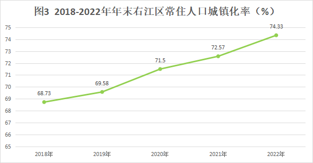 年末右江區(qū)常住人口[3]47.14萬人,比上年末減少0.18萬人,其中城鎮(zhèn)人口35.04萬人,占常住人口比重(常住人口城鎮(zhèn)化率)為74.33%,比上年末提高1.76個百分點。全年出生人口2817人,出生率為6.69‰;死亡人口2883人,死亡率為6.85‰;自然增長率為-0.16‰。