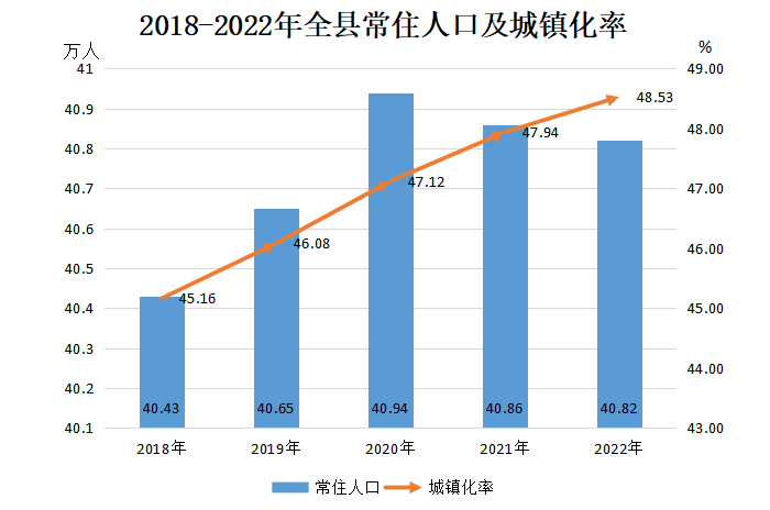 年末全縣常住人口[5]為40.82萬人,其中城鎮(zhèn)人口為19.81萬人,城鎮(zhèn)化率為48.5%。