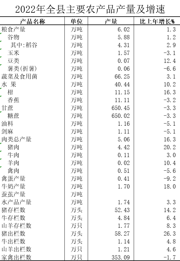 全縣農(nóng)作物總播種面積135824.04公頃,比上年下降1.2%,糧食作物播種面積14310.79公頃,增長0.1%,糧食總產(chǎn)量60154.83噸,增長1.3%,其中:?稻谷播種面積9495.17公頃,下降0.1%,總產(chǎn)量43130.18噸,?增長2.9%;玉米播種面積4119.93公頃,增長1.9%,總產(chǎn)量15697.27噸,?下降3.1%;豆類播種面積423.78公頃,增長7.4%,總產(chǎn)量724.78噸,增長12.4%。糖料蔗種植面積73343.36公頃,比上年下降2.2%,總產(chǎn)量6500192噸,?下降3.3%;蔬菜播種面積20200.07公頃,增長3.2%,總產(chǎn)量662438.63噸,?增長3.1%。全年全縣園林水果產(chǎn)量404396.56噸,比上年增長10.2%。其中:香蕉產(chǎn)量111115.7噸,下降3.2%,橙產(chǎn)量38118.2噸,增長9.3%,柑產(chǎn)量111532噸,增長16.3%,龍眼產(chǎn)量10595.5噸,增長2.1%,芒果產(chǎn)量5164.32噸,增長0.5%,荔枝產(chǎn)量1976.6噸,增長8.3%。年末果園面積12597.67公頃。