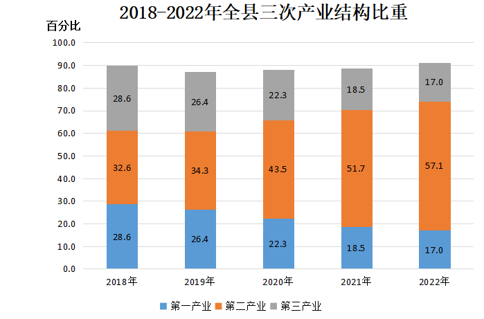 初步核算,全年全縣實(shí)現(xiàn)生產(chǎn)總值[2](當(dāng)年價(jià))2892820萬元,按可比價(jià)格計(jì)算,比上年增長9.4%,其中第一產(chǎn)業(yè)增加值492107萬元,增長4.9%;第二產(chǎn)業(yè)增加值1651758萬元,增長19.8%;第三產(chǎn)業(yè)增加值748954萬元,下降2%。三次產(chǎn)業(yè)結(jié)構(gòu)比重為17:57.1:25.9。人均GDP為70833元,比上年增長9.5%。全年完成財(cái)政收入150560萬元,比上年下降19.5%,其中一般公共預(yù)算收入81058萬元,下降19.2%,一般公共預(yù)算支出329505萬元,下降21.6%。財(cái)政收入占GDP的比重為5.2%,比上年下降2.7個(gè)百分點(diǎn)。