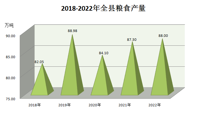 全年糧食總產(chǎn)量88.00萬(wàn)噸。其中,水稻產(chǎn)量12.12萬(wàn)噸,玉米產(chǎn)量74.44萬(wàn)噸,豆類產(chǎn)量0.94萬(wàn)噸,薯類(鮮薯)產(chǎn)量2.50萬(wàn)噸。