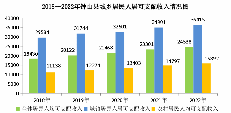 2022年全縣居民人均可支配收入24538元,名義增長5.3%。城鎮(zhèn)居民人均可支配收入為36415元,名義增長4.1%。農村居民人均可支配收入15892元,名義增長7.4%