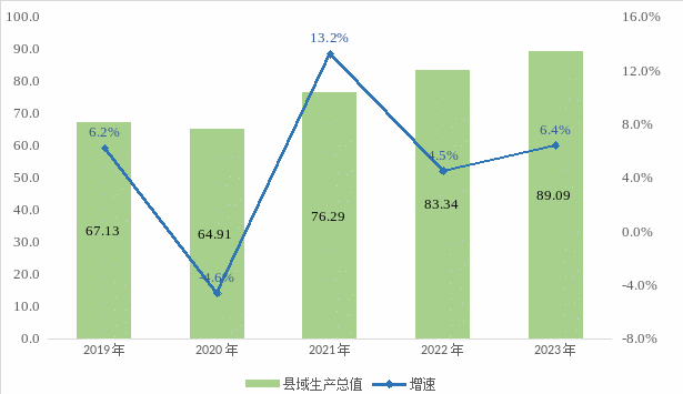 初步核算,全縣完成地區(qū)生產(chǎn)總值89.09億元,按不變價(jià)計(jì)算,同比增長6.4%。其中:第一產(chǎn)業(yè)增加值21.38億元,同比增長5.1%;第二產(chǎn)業(yè)增加值16.22億元,同比增長6.3%;第三產(chǎn)業(yè)增加值51.49億元,同比增長6.9%。三次產(chǎn)業(yè)結(jié)構(gòu)由2022年的23.2:20.4:56.4調(diào)整為24.0:18.2:57.8,第一產(chǎn)業(yè)占比上升0.8個(gè)百分點(diǎn),第二產(chǎn)業(yè)占比下降2.2個(gè)百分點(diǎn),第三產(chǎn)業(yè)占比上升1.4個(gè)百分點(diǎn)。全縣人均地區(qū)生產(chǎn)總值51084元。