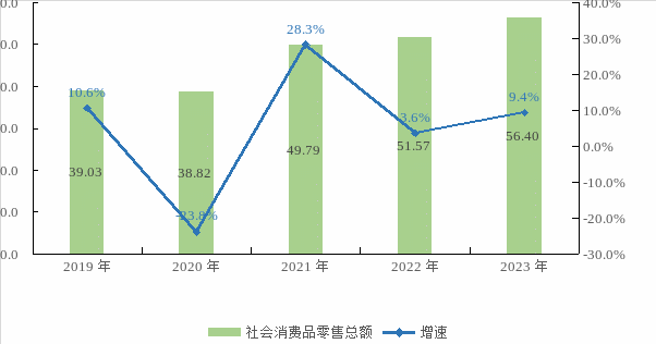 圖5:2019年—2023年社會(huì)消費(fèi)品零售總額及增速
