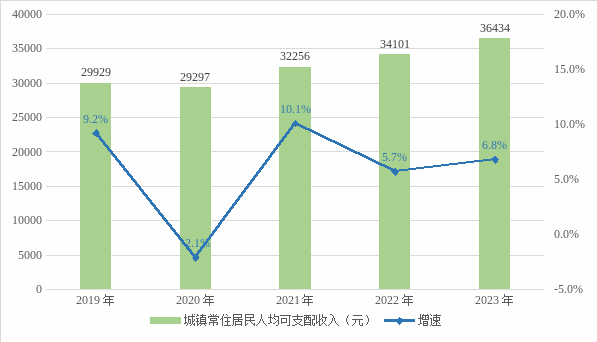 全年城鎮(zhèn)常住居民人均可支配收入36434元,比上年增加2333元,同比增長6.8%。