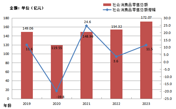 全市實(shí)現(xiàn)社會(huì)消費(fèi)品零售總額172.07億元,增長(zhǎng)11.5%。其中,限額以上企業(yè)(單位)消費(fèi)品零售額52.37億元,增長(zhǎng)15.5%。按經(jīng)營地統(tǒng)計(jì),城鎮(zhèn)實(shí)現(xiàn)零售額43.69億元,增長(zhǎng)11.2%;鄉(xiāng)村實(shí)現(xiàn)零售額8.68億元,增長(zhǎng)43.9%。