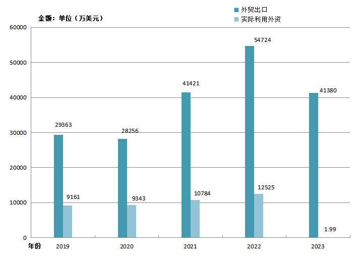 全市出口累計(jì)完成41.4億元,同比增長(zhǎng)13.6%。實(shí)際利用外資1.99萬美元,同比下降99.8%。