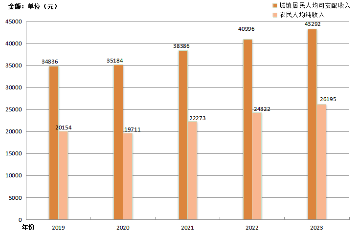 圖4 2019-2023年城鎮(zhèn)居民人均可支配收入與農(nóng)民人均純收入