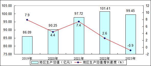 2023年全縣地區(qū)生產(chǎn)總值99.45億元,比上年下降0.9%,經(jīng)濟(jì)總量排全州第9位。分產(chǎn)業(yè)看,第一產(chǎn)業(yè)增加值27.93億元,增長3.8%;第二產(chǎn)業(yè)增加值17.24億元,下降17.3%;第三產(chǎn)業(yè)增加值54.28億元,增長3.2%。第一產(chǎn)業(yè)、第二產(chǎn)業(yè)、第三產(chǎn)業(yè)增加值占生產(chǎn)總值的比重分別為28.08%、17.34%和54.58%。與上年相比,第一產(chǎn)業(yè)占生產(chǎn)總值的比重較上年上升了0.9個百分點(diǎn),第二產(chǎn)業(yè)增加值占生產(chǎn)總值的比重下降了3.38個百分點(diǎn),第三產(chǎn)業(yè)增加值占生產(chǎn)總值的比重下降了2.5個百分點(diǎn)。全縣人均地區(qū)生產(chǎn)總值為42895元,比上年減少930元。