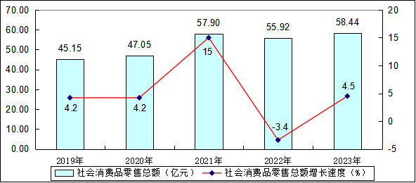 全年社會消費(fèi)品零售總額58.44億元,比上年增長4.5%。
