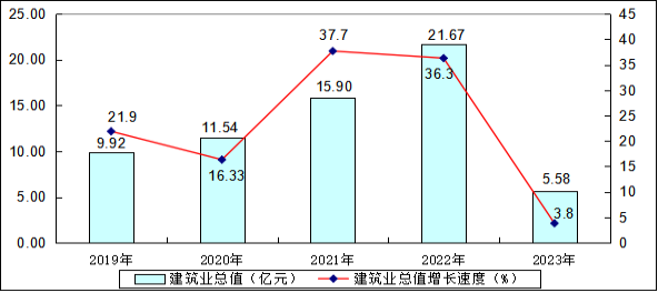 圖5平塘縣2019—2023年資質(zhì)以上建筑業(yè)總產(chǎn)值及增長速度