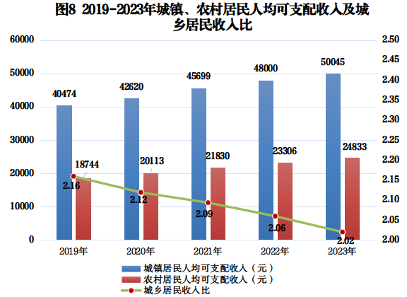 ? 人均可支配收入24833元,增長6.6%。城鄉(xiāng)居民收入比2.02:1,比上年縮小0.04。
