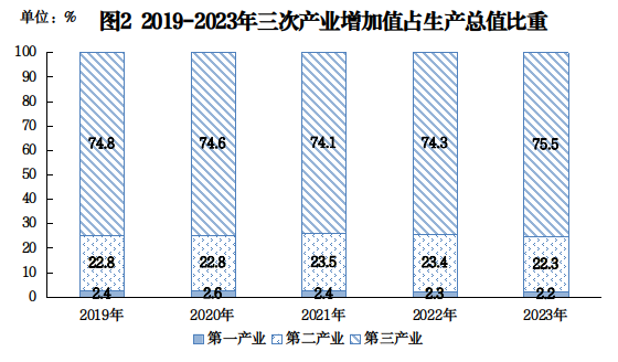 ? 經(jīng)市統(tǒng)計局統(tǒng)一核算,全年全區(qū)地區(qū)生產(chǎn)總值436.4億元,比上年增長6.5%。其中,第一產(chǎn)業(yè)增加值9.5億元,增長3.3%;第二產(chǎn)業(yè)增加值97.2億元,增長4.9%;第三產(chǎn)業(yè)增加值329.7億元,增長7.1%。三次產(chǎn)業(yè)對經(jīng)濟(jì)增長的貢獻(xiàn)率分別為1.2%、17.5%和81.3%,分別拉動GDP增長0.08、0.7和5.86個百分點(diǎn)。經(jīng)濟(jì)結(jié)構(gòu)進(jìn)一步調(diào)整。三次產(chǎn)業(yè)結(jié)構(gòu)比由上年的2.3:23.4:74.3調(diào)整為2.2:22.3:75.5,第三產(chǎn)業(yè)占比較上年提升1.2個百分點(diǎn)。人均地區(qū)生產(chǎn)總值80418元,增長5.7%。