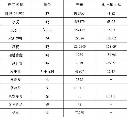 全年規(guī)模以上工業(yè)產(chǎn)品產(chǎn)量:鉀肥982953噸(折純后),同比下降1.82%;水泥563379噸,同比增長(zhǎng)65.92%;混凝土467449立方米,同比增長(zhǎng)164.30%;水泥電桿29586根,同比增長(zhǎng)103.02%;煤炭1242540噸,同比增長(zhǎng)118.69%;硅錳合金1985噸,同比下降51.96%;干制紅棗2019噸,同比下降59.22%;能源企業(yè)發(fā)電48807萬(wàn)千瓦時(shí),同比增長(zhǎng)11.19%;碳酸鋰2392噸;鐵精粉129150噸;風(fēng)機(jī)塔筒82套,同比增長(zhǎng)811.1%;發(fā)電機(jī)組79套;飼料73735噸。