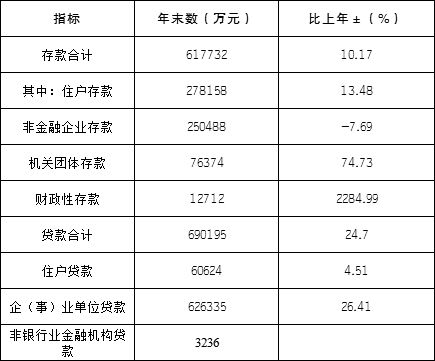 全縣年末金融機(jī)構(gòu)各項(xiàng)存款余額617732萬(wàn)元,同比增長(zhǎng)10.17%,其中:住戶存款余額278158萬(wàn)元,同比增長(zhǎng)13.48%;非金融企業(yè)存款余額250488萬(wàn)元,同比下降7.69%。全縣年末金融機(jī)構(gòu)各項(xiàng)貸款余額690195萬(wàn)元,同比增長(zhǎng)24.70%,其中:住戶貸款余額60625萬(wàn)元,同比增長(zhǎng)4.51%;企(事)業(yè)單位貸款余額626335萬(wàn)元,同比增長(zhǎng)26.41%;非銀行業(yè)金融機(jī)構(gòu)貸款3236萬(wàn)元。