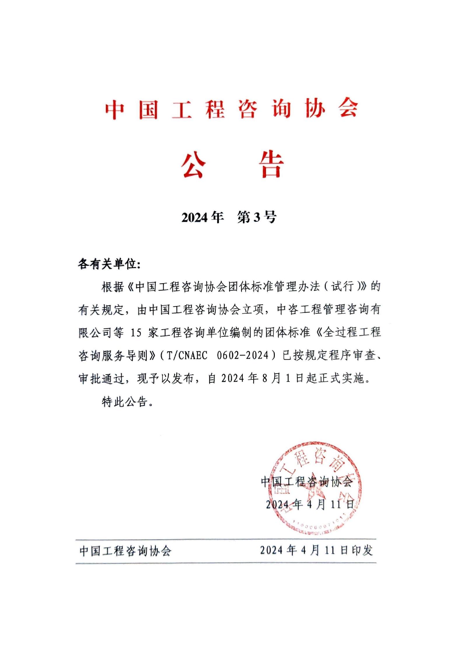 《全過程工程咨詢服務(wù)導(dǎo)則》(TCNAEC 0602-2024)發(fā)布公告