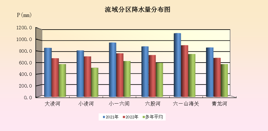 地區(qū)分布 從流域分布看:全流域均為豐水年份。大凌河流域降水量675.8毫米,比多年平均值增加18.2%;小凌河流域降水量為707.9毫米,比多年平均值增加39.2%;小凌河至六股河流域降水量為761.4毫米,比多年平均值增加21.4%;六股河流域降水量為731.4毫米,比多年平均值增加22.7%;六股河至山海關區(qū)間降水量為902.5毫米,比多年平均值增加20.4%;青龍河流域降水量為682.5毫米,比多年平均值增加19.3%。
