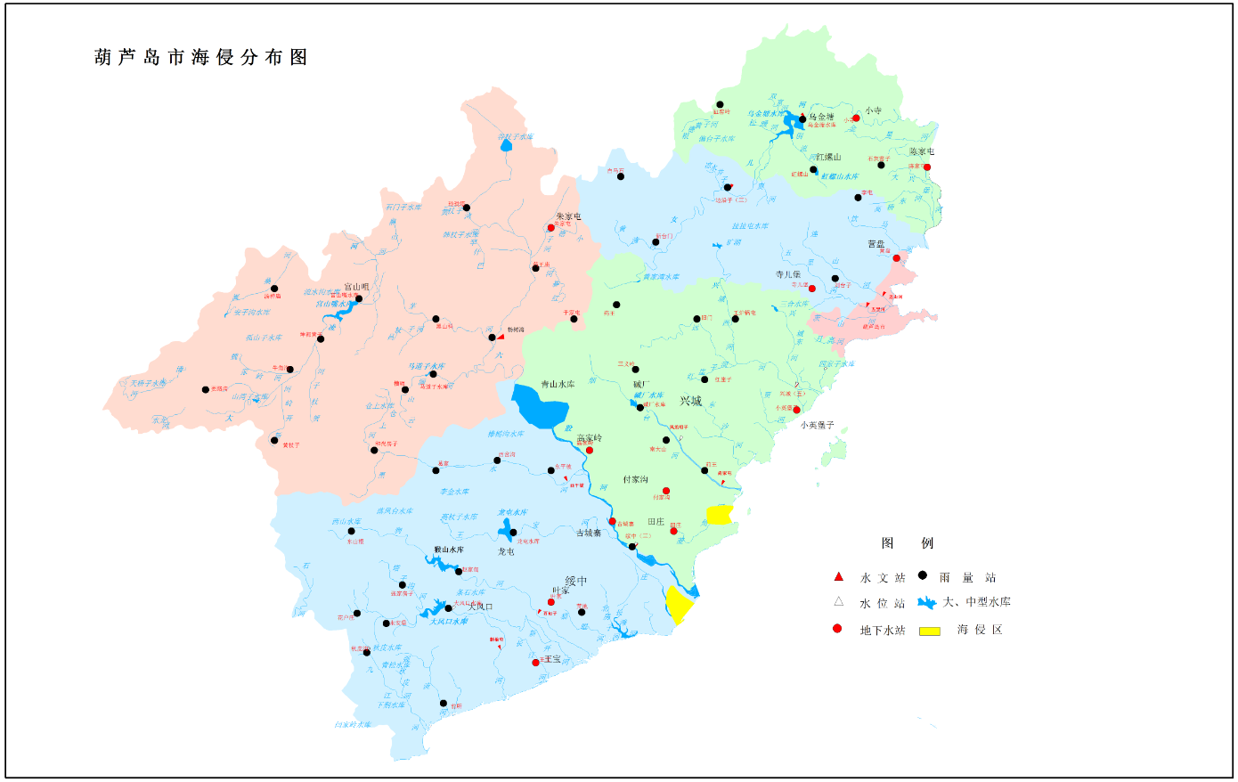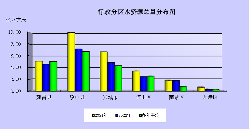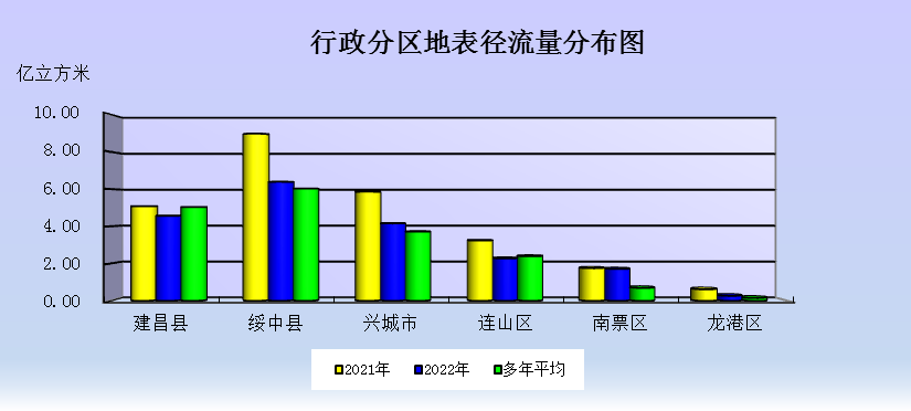 行政分區(qū)用水量:建昌縣0.59億立方米,綏中縣1.31億立方米,興城市0.70億立方米,南票區(qū)0.35億立方米,連山區(qū)0.80立方米,龍港區(qū)0.59億立方米。