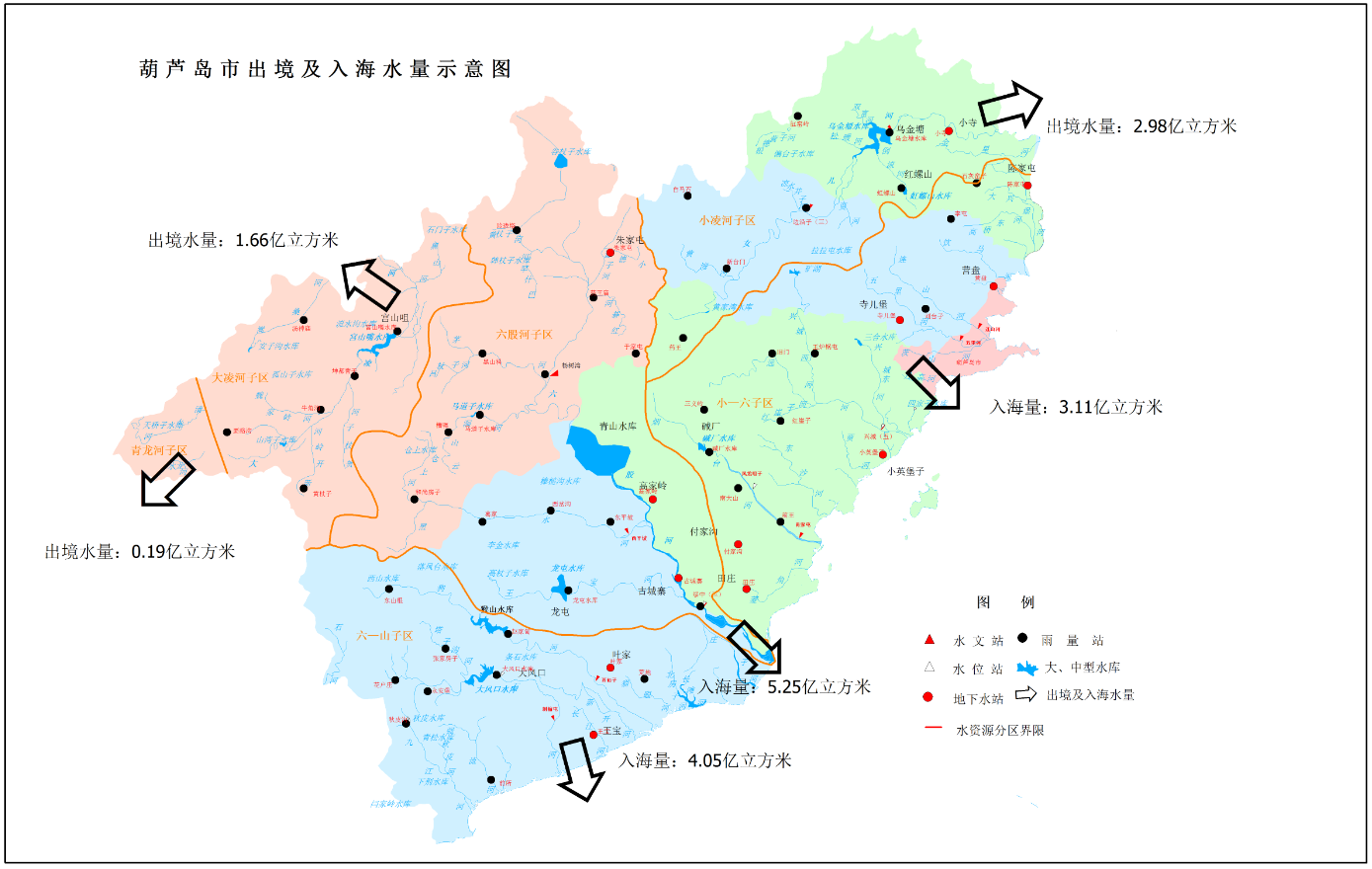 按流域來看:大凌河出境水量為1.66億立方米,小凌河出境水量為2.98億立方米,小—六間入海量為3.11億立方米,六股河入海水量為5.25億立方米,六—山海關入海水量為4.05億立方米,青龍河出境水量為0.19億立方米。