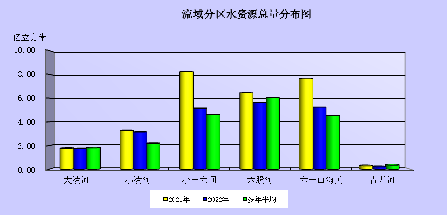 各流域地表水資源量:大凌河為1.72億立方米,多年平均值為1.79億立方米,2022年比多年平均值偏少3.5%;小凌河為3.10億立方米,多年平均值為2.24億立方米,2022年比多年平均值偏多38.3%;小凌河至六股河區(qū)間為4.36億立方米,多年平均值為3.82億立方米,2022年比多年平均值偏多14.3%;六股河為5.51億立方米,多年平均值為5.90億立方米,2022年比多年平均值偏少6.6%;六股河至山海關區(qū)間為4.48億立方米,多年平均值為3.92億立方米,2022年比多年平均值偏多14.3%;青龍河為0.21億立方米,多年平均值為0.36億立方米,2022年比多年平均值偏少42.0%。