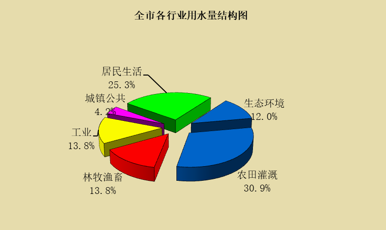 用水量指分配給用戶的包括輸水損失在內的毛用水量。2022年全市總用水量4.34立方米,比上年減少0.10億立方米。其中,農田灌溉用水量1.34億立方米,占總用水量的30.9%;林牧漁畜業(yè)用水量0.60億立方米,占總用水量的13.8%;工業(yè)用水量0.60億立方米,占總用水量的13.8%;城鎮(zhèn)公共用水量0.18億立方米,占總用水量的4.2%;居民生活用水量1.10億立方米,占總用水量的25.3%;生態(tài)環(huán)境用水量0.52億立方米,占總用水量的12.0%。