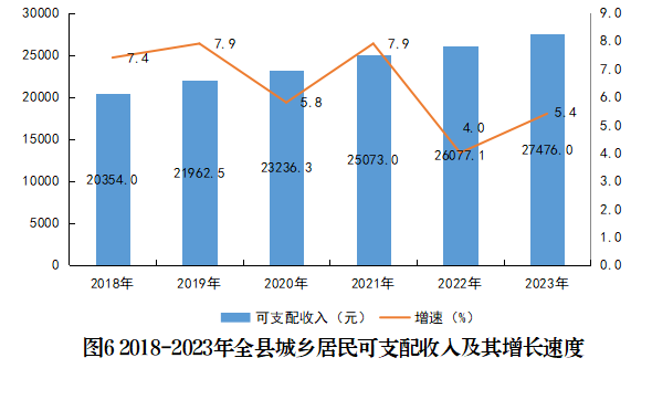 全年全縣城鄉(xiāng)居民可支配收入27476元,增長5.4%,城鎮(zhèn)居民可支配收入34229元,增長4.6%;農(nóng)村居民可支配收入22439元,增長5.7%。