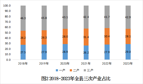 據(jù)韶關(guān)市地區(qū)生產(chǎn)總值統(tǒng)一核算結(jié)果,2023年始興縣地區(qū)生產(chǎn)總值103.09億元,同比增長3.5%。其中,第一產(chǎn)業(yè)增加值29.96億元,增長6.9%;第二產(chǎn)業(yè)增加值28.95億元,下降1.1%;第三產(chǎn)業(yè)增加值44.18億元,增長4.1%;三次產(chǎn)業(yè)結(jié)構(gòu)為29.0:28.1:42.9。人均地區(qū)生產(chǎn)總值51987元,增長3.5%。