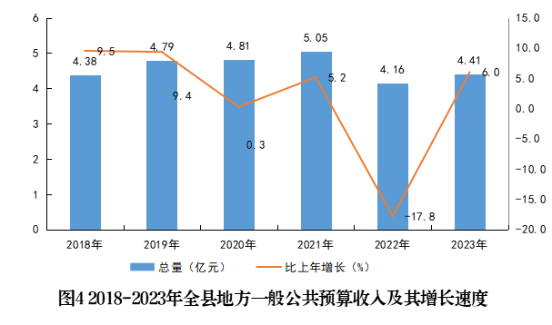 全年全縣地方一般公共預(yù)算收入4.41億元,同比增長6.0%,其中:稅收收入2.63億元,增長47.9%,非稅收入1.78億元,下降25.3%。地方一般公共預(yù)算支出30.16億元,同比增長18.9%,其中一般公共服務(wù)支出3.10億元,與上年保持持平;教育支出4.34億元,同比增長5.6%;社會(huì)保障和就業(yè)支出4.61億元,增長13.6%;衛(wèi)生健康支出2.96億元,同比增長6.7%;農(nóng)林水事務(wù)支出5.29億元,同比增長9.8%。