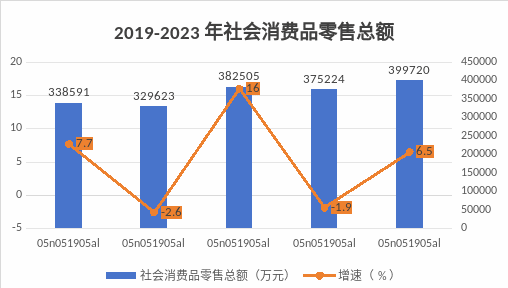 全年社會消費品零售總額39.97億元,比上年增長6.5%。按經(jīng)營單位所在地分,城鎮(zhèn)消費品零售額24.96億元,增長5.8%;鄉(xiāng)村消費品零售額15.01億元,增長7.6%。按消費類型分,商品零售22.08億元,增長9.2%;餐飲收入17.89億元,增長3.3%。
