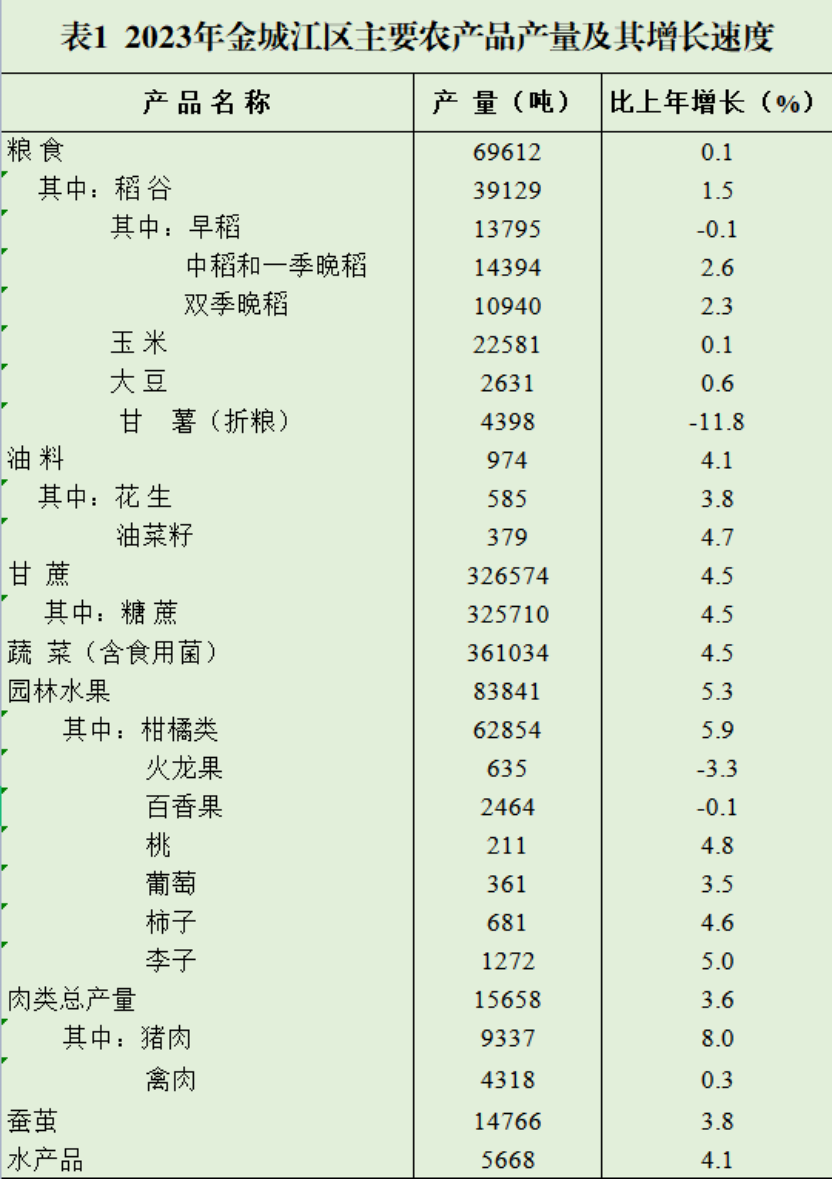 全年甘蔗產(chǎn)量326574噸,增產(chǎn)4.5%。蔬菜產(chǎn)量(含食用菌)361034噸,增產(chǎn)4.5%。水果產(chǎn)量83841噸,增產(chǎn)5.3%。