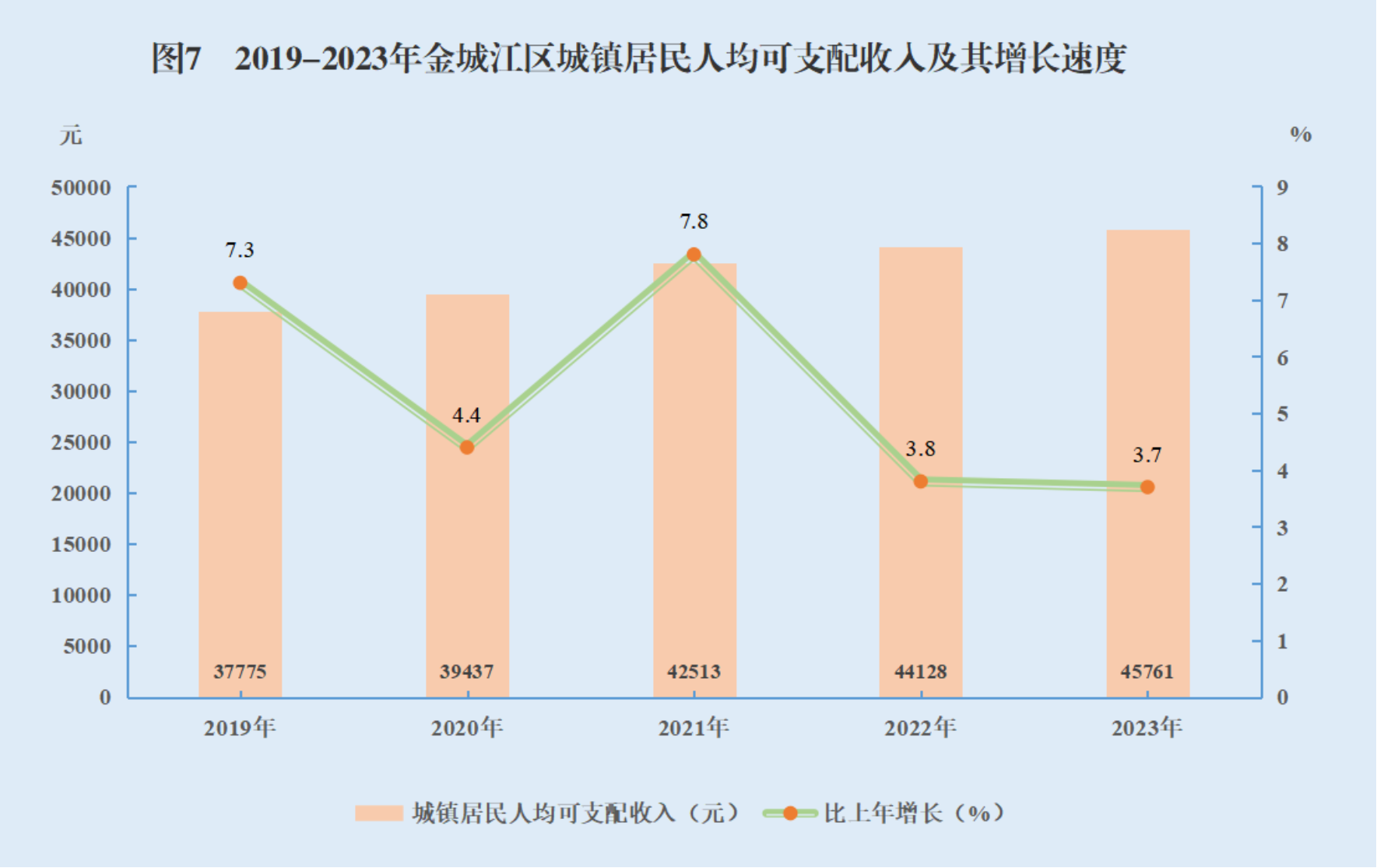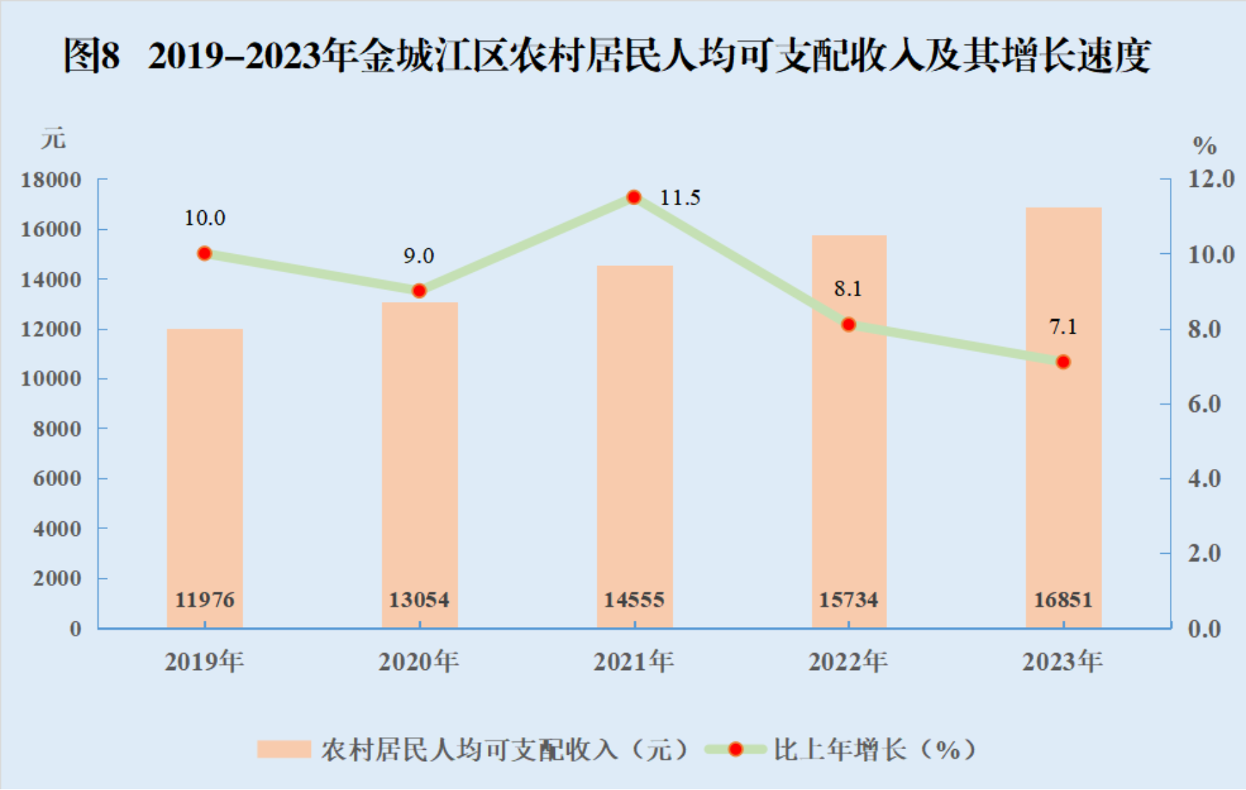 全年全區(qū)居民人均可支配收入30656元,比上年名義增長4.7%。按常住地分,城鎮(zhèn)居民人均可支配收入45761元,比上年名義增長3.7%;農(nóng)村居民人均可支配收入16851元,比上年名義增長7.1%。城鄉(xiāng)居民人均收入比為2.7:1,比上年縮小0.1。