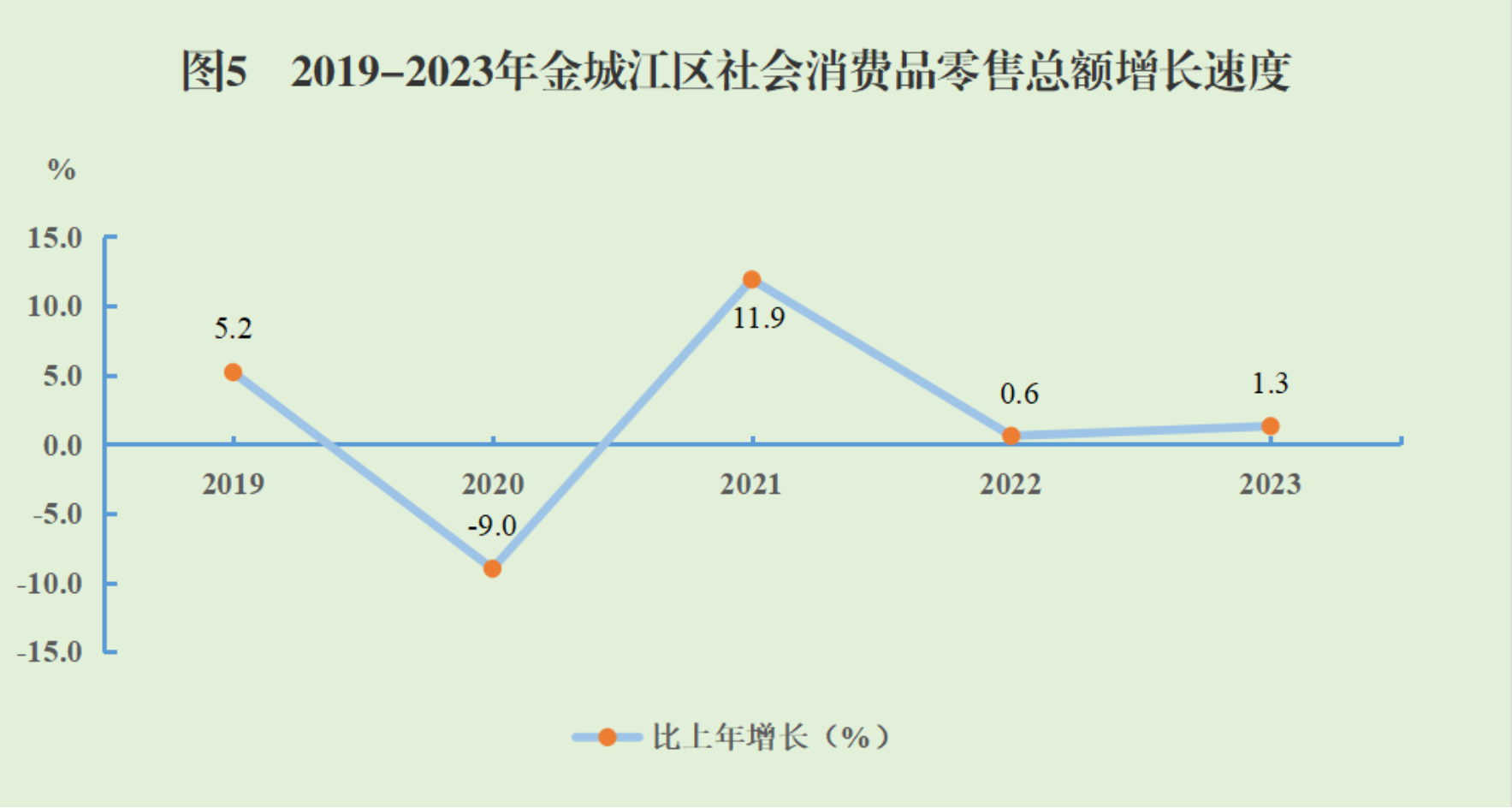 全年社會(huì)消費(fèi)品零售總額比上年增長1.3%。按經(jīng)營地統(tǒng)計(jì),城鎮(zhèn)消費(fèi)品零售額增長1.1%;鄉(xiāng)村消費(fèi)品零售額增長5.3%。按消費(fèi)類型統(tǒng)計(jì),商品零售額增長1.2%;餐飲收入增長6.6%。
