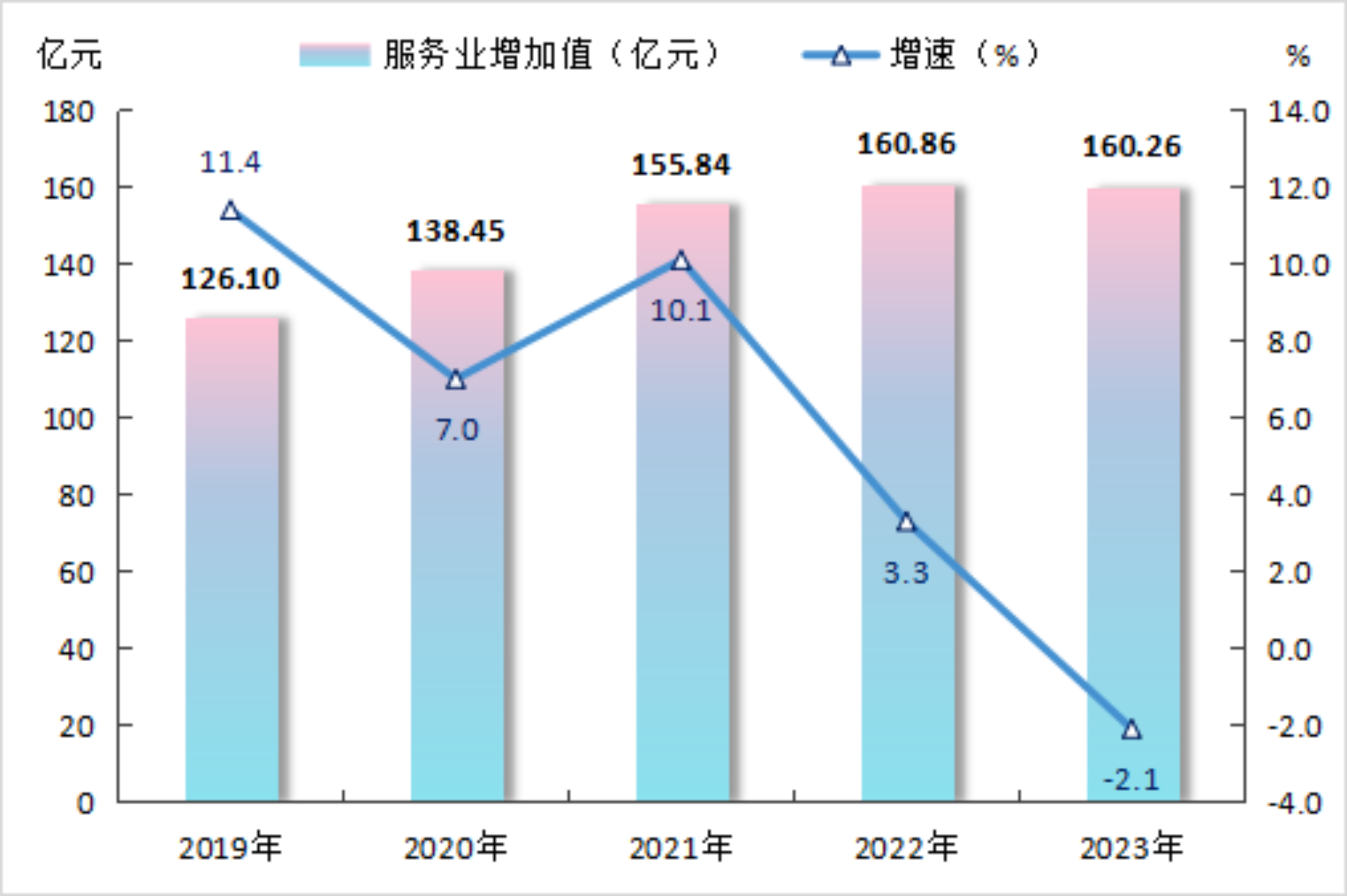 全年批發(fā)和零售業(yè)增加值195825萬元,比上年下降33.3%;住宿和餐飲業(yè)增加值26703萬元,增長6.1%;交通運(yùn)輸、倉儲和郵政業(yè)增加值101999萬元,增長3.0%;金融業(yè)增加值244336萬元,增長10.5%;房地產(chǎn)業(yè)增加值227135萬元,增長1.1%;其他服務(wù)業(yè)增加值773364萬元,增長4.3%。