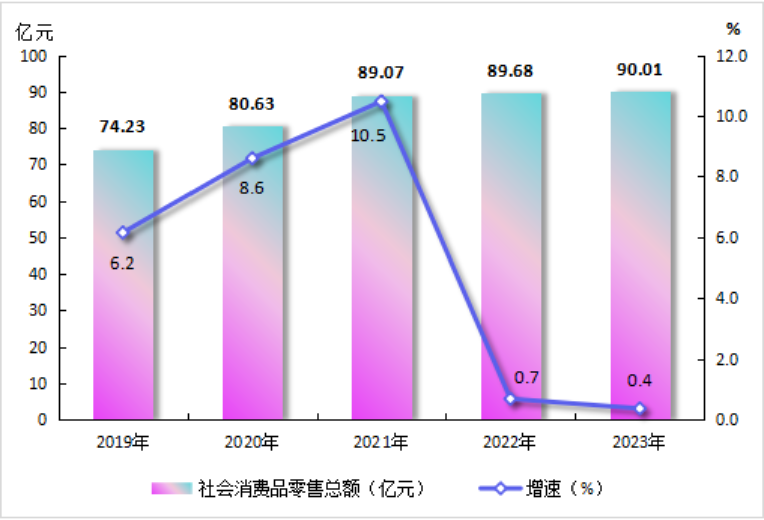全年社會消費(fèi)品零售總額900137萬元,比上年增長0.4%。按經(jīng)營地統(tǒng)計,城鎮(zhèn)消費(fèi)品零售額687159萬元,增長1.0%;鄉(xiāng)村消費(fèi)品零售額212978萬元,下降1.6%。按消費(fèi)類型統(tǒng)計,商品零售實(shí)現(xiàn)零售額843795萬元,下降0.4%;餐飲收入實(shí)現(xiàn)零售額56342萬元,增長12.7%。全年限額以上單位商品零售額中,糧油食品類比上年增長7.5%,化妝品類增長6.1%,日用品類下降13.2%,文化辦公用品類增長29.5%,石油及制品類下降2.6%,汽車類下降20.5%。
