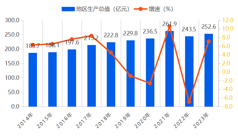 初步核算,全區(qū)實現(xiàn)地區(qū)生產(chǎn)總值252.6億元,按可比價格計算,比上年增長7.1%。其中,第一產(chǎn)業(yè)增加值51.6億元,比上年增長0.6%;第二產(chǎn)業(yè)增加值71.1億元,比上年增長18.5%;第三產(chǎn)業(yè)增加值129.9億元,比上年增長4.4%。三次產(chǎn)業(yè)結構調(diào)整為20.4:28.2:51.4。人均地區(qū)生產(chǎn)總值達到33169元,比上年增長4.8%。