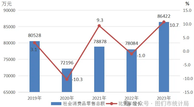 全年社會消費(fèi)品零售總額86422萬元,比上年增長10.7%。其中,城鎮(zhèn)消費(fèi)品零售額71646萬元,增長11.5%;鄉(xiāng)村消費(fèi)品零售額14776萬元,增長6.6%。