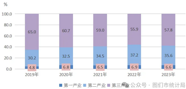 圖2 2019—2023年三次產(chǎn)業(yè)增加值占地區(qū)生產(chǎn)總值比重