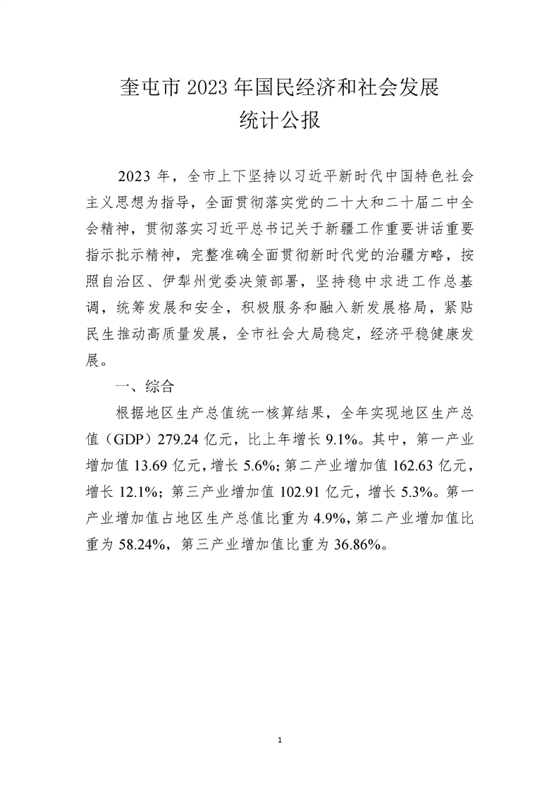 (新疆)2023年伊犁哈薩克自治州奎屯市國民經(jīng)濟(jì)和社會(huì)發(fā)展統(tǒng)計(jì)公報(bào)