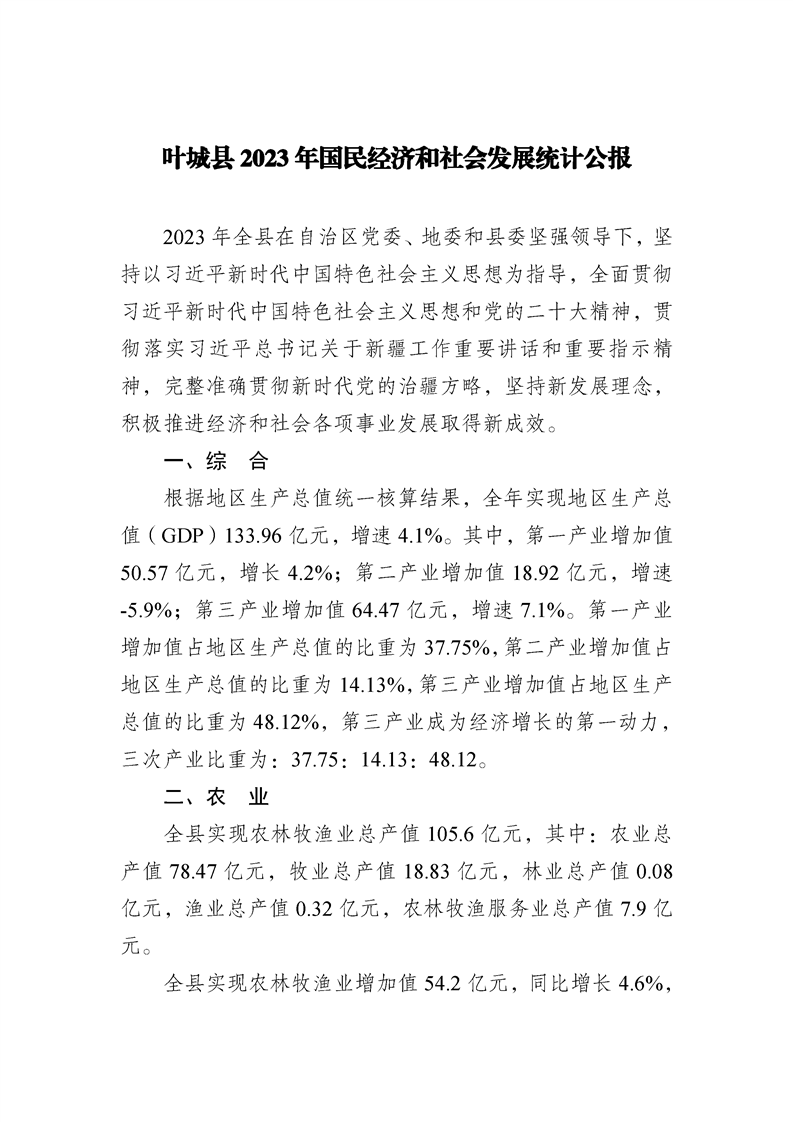 (新疆)2023年喀什地區(qū)葉城縣國民經(jīng)濟和社會發(fā)展統(tǒng)計公報
