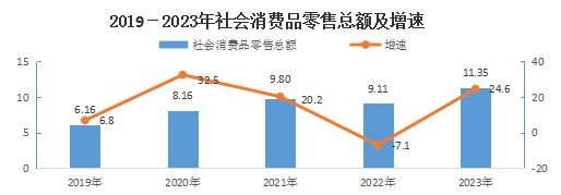 全年社會消費(fèi)品零售總額11.35億元,比上年增長24.6%。按經(jīng)營地統(tǒng)計,城鎮(zhèn)消費(fèi)品零售額7.92億元,上升26.1%;鄉(xiāng)村消費(fèi)品零售額3.43億元,上升21.1%。按消費(fèi)類型統(tǒng)計,商品零售額9.96億元,上升17.1%;餐飲收入額1.39億元,上升112%。