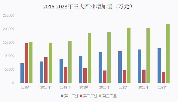 三次產(chǎn)業(yè)結(jié)構(gòu)比從2022年的32.8:13.2:54調(diào)整為32.9:10.8:56.3,第一產(chǎn)業(yè)保持相對(duì)平穩(wěn)的結(jié)構(gòu),第二產(chǎn)業(yè)下調(diào)2.4個(gè)百分點(diǎn),第三產(chǎn)業(yè)上升2.3個(gè)百分點(diǎn)。