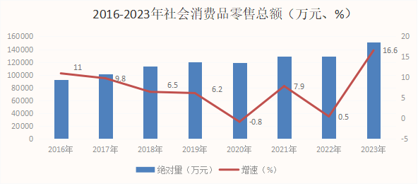 2023年,全縣社會(huì)消費(fèi)品零售總額完成15.08億元,同比增長16.6%。